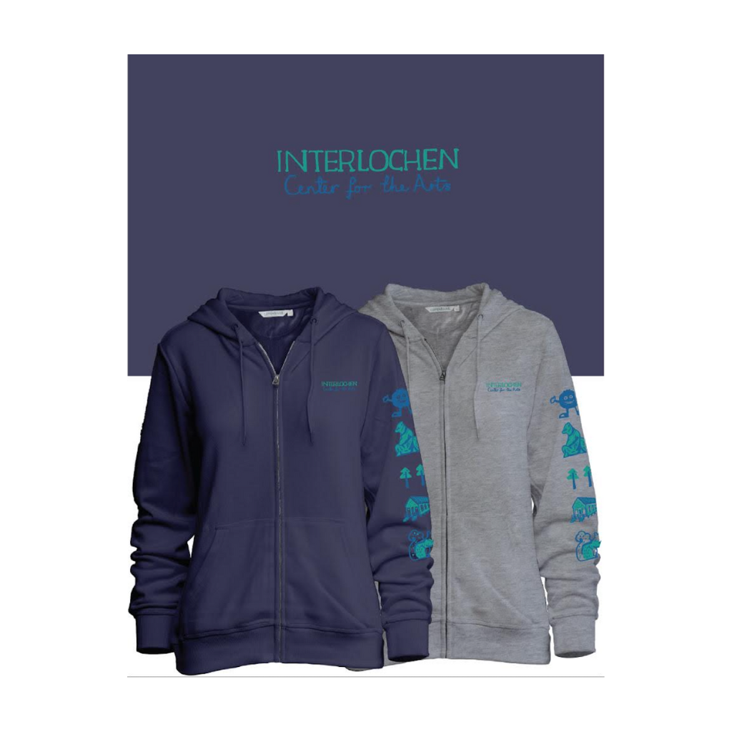 Cozy, creative, and full of artistic pride, this full zip hoodie in heather grey or navy showcases all Interlochen disciplines on the sleeves. Perfect for making music, dancing, or creating—wear all the arts wherever you go.